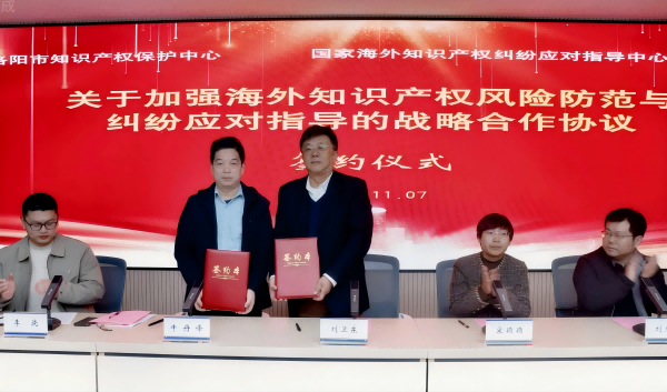 为加强海外知识产权保护协作,共同服务企业“走出去”,11月7日,洛阳市知识产权保护中心与国家海外知识产权纠纷应对指导中心河南分中心在保护中心会议室成功举行《关于加强海外知识产权风险防范与纠纷应对指导的战略合作协议》签约仪式。此举标志着双方将构建更加紧密的协作关系,将为洛阳市出口企业开拓国际市场提供坚实的知识产权支撑与保障。